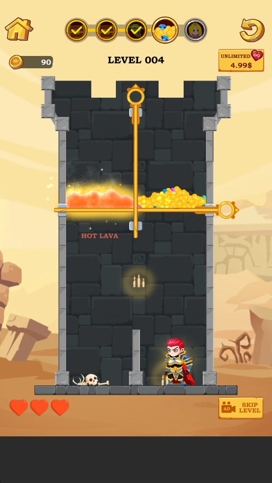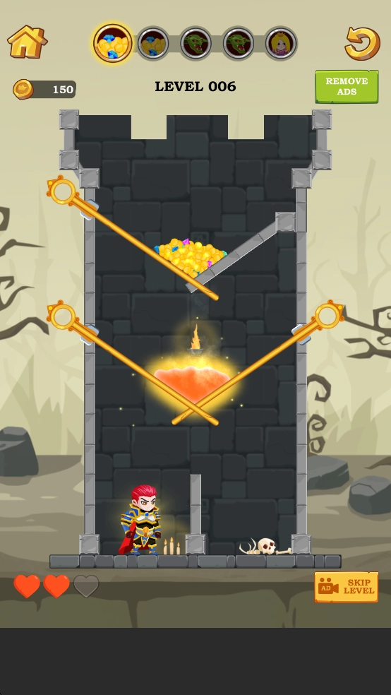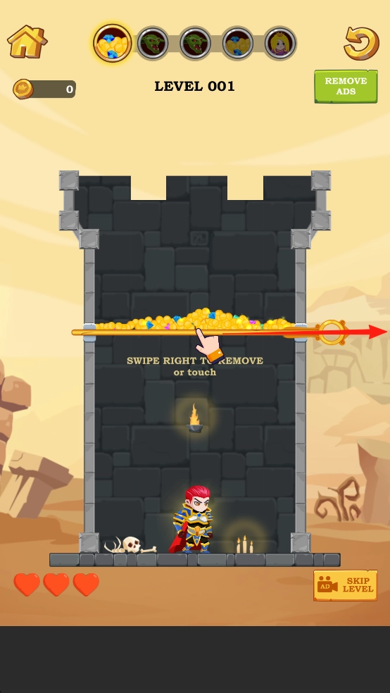 你热衷于冒险吗?那是自然,冒险的体验总是令人着迷。快加入进来,帮助英雄解救公主、获取宝藏吧!通过拉动销钉,为抵达公主所在之处开辟一条安全通道。在这款全新的救援游戏里,你就能化身那位收获满满的英雄。