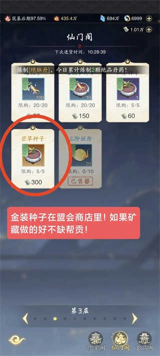 8、灵石商店的建筑材料,前期建议直接买空;三阶灵石在丹药还没吃满30个之前,也都要全部买空。至于种子,在快要进阶的时候就不要再购买了!