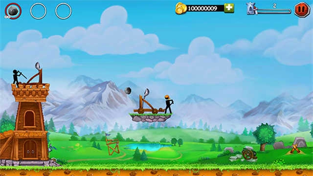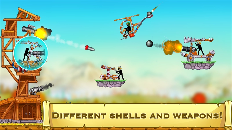 玩家只需点击屏幕,拉动弹射器并选择合适的张力,随后释放弹射器向敌人发射炮弹,你的火柴人英雄就会自动投入战斗。