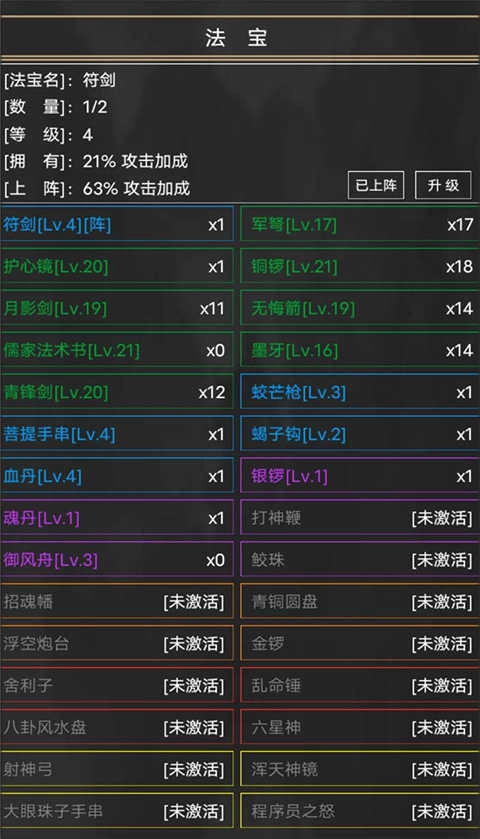 法宝只要拥有就能获得属性加成,数量越多效果越好。它主要提升的是命中和生命这两项属性,其中命中属性尤为关键。