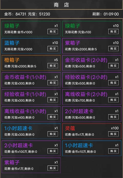 进入8品境界后会解锁一个新的装备系统,虽然单看面板增加的战力不算特别突出,但对于推进关卡来说作用显著。从8品晋升到7品的过程中,等级提升和装备强化是核心任务。金币的使用方面,除了在神秘商店把英魂类商品各购买一份外,剩余的全部用来购买1000金币一个的绿色宝箱——开这些宝箱能获得经验值;另外,像超速卡之类的道具也都需要备齐。