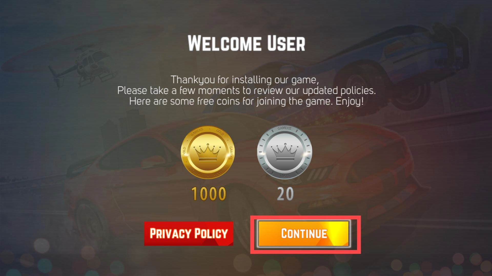 1、点击CONTINUE后,玩家在进入前可以查看隐私政策,了解奖励机制,为驾驶竞速环节做好准备,并且能体验无限挑战的乐趣。