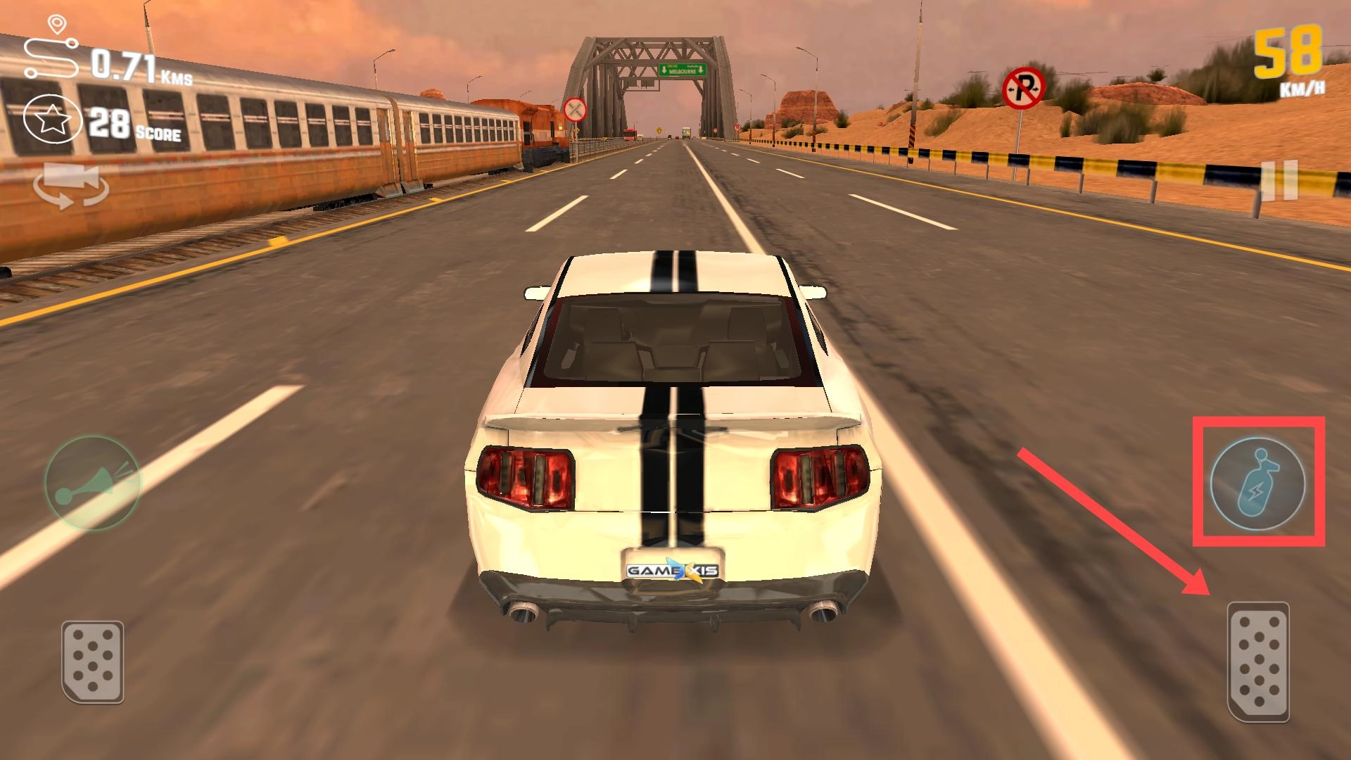 驾驶过程中,注意观察右侧的道具图标,根据实际情况合理运用加速道具,同时通过虚拟按键操控方向,在公路上避开障碍物并完成车辆超越。