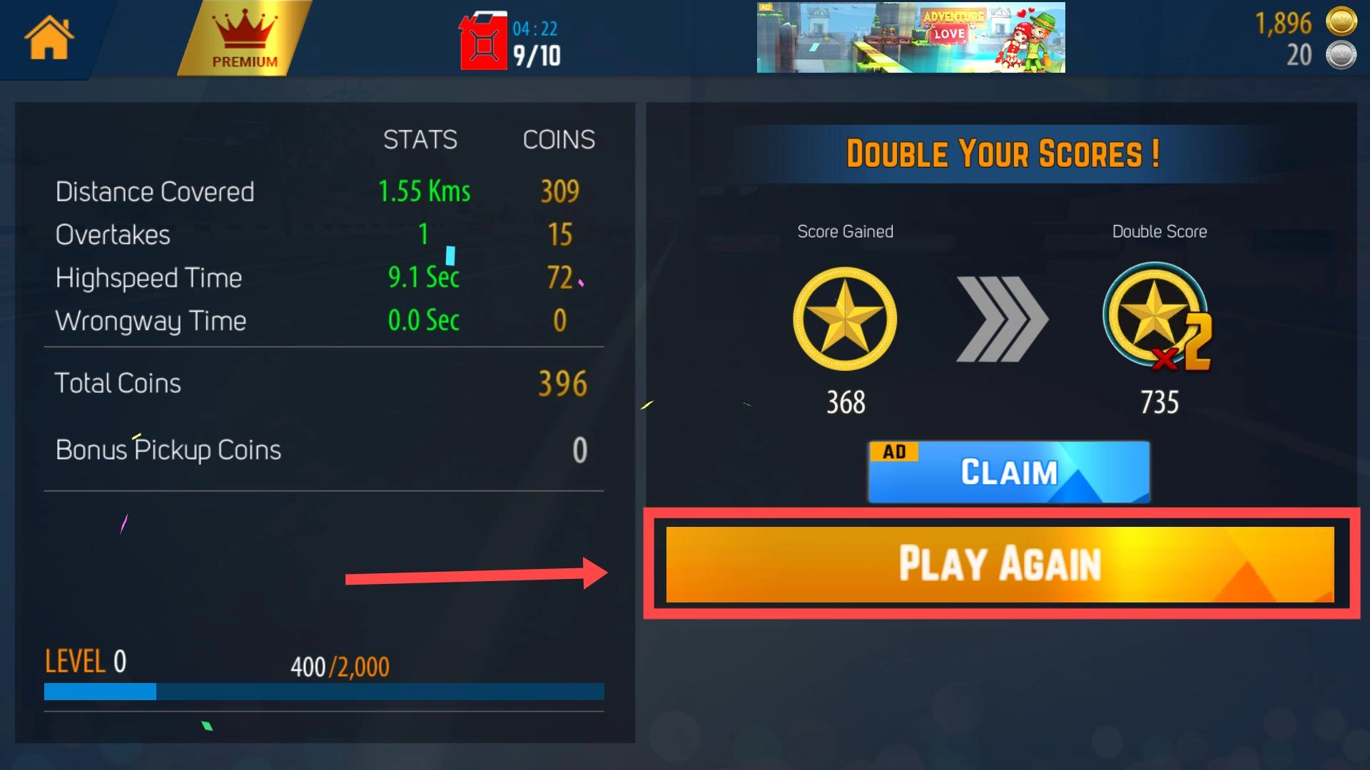3、一局结束后,根据行驶数据,点击PLAY AGAIN重新挑战,可尝试不同驾驶策略,以获取更高分数和金币。