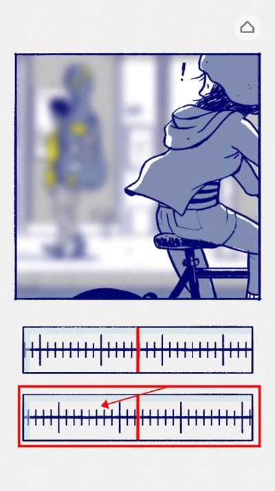 2、故事开场时,小女孩发现身后有车辆驶来,但画面十分模糊。这时我们需要将上方的刻度向右滑动,直到肉眼观察到画面最清晰的状态——通常这个位置对应刻度上最长的线或中间的线。接着把下方的刻度尺向左滑动,待整个画面达到高清效果后,就能进入下一个场景了。
