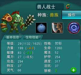 以一个弱渣兽族的兽人战士为例。现在打开我的生物背包,看看我的兽人战士,它的各项属性都能看得一清二楚。