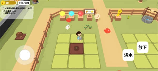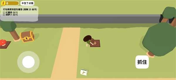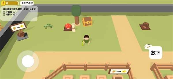 1、进入游戏后界面如图所示,玩家首先要依据左上方的任务提示,拾取一个红蘑菇并放置到蓝色桌垫上。