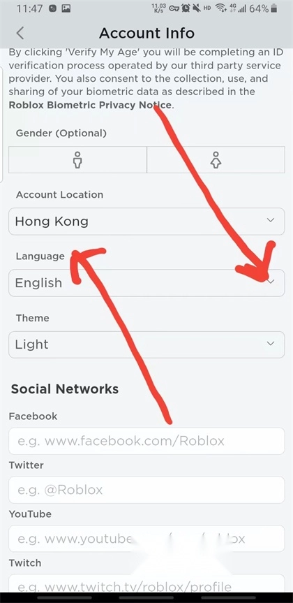 4.进去用户信息界面向下翻页找到language(语言)然后右边有一个向下的箭头点击
