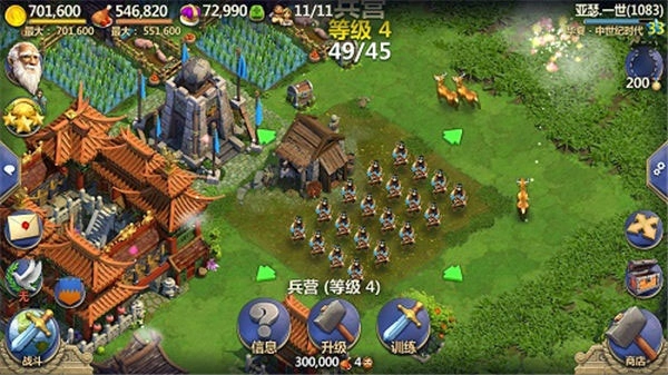 采集祝福:提升狩猎、采集的效率与奖励数量;铠甲祝福:增加兵营单位的生命值;生命祝福:提高建筑的生命值。寺庙的祝福同样参照《战争与文明》的玩法,围绕资源养成、战斗攻伐和建筑防御三个维度展开。