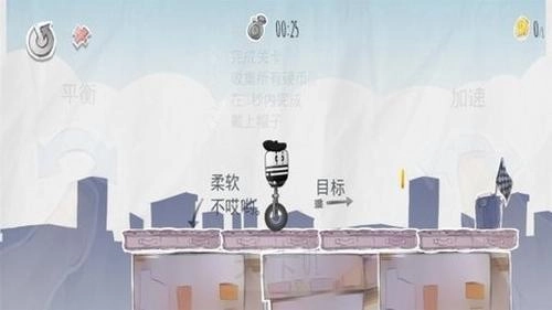 3、在前进的过程中,要收集沿途散落的硬币,同时留意避开平台边缘和各种障碍物,避免独轮车掉落而致使挑战失败。