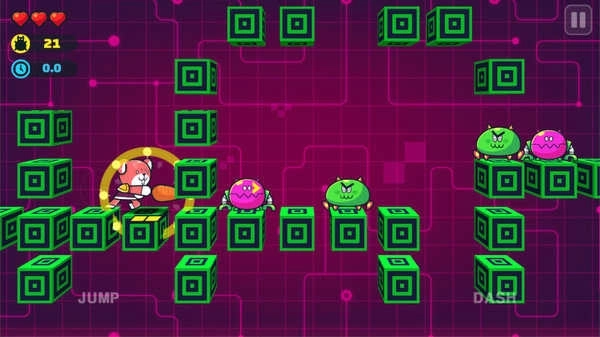 2、关卡里设有大量绿色平台方块,玩家需操控角色在这些平台上完成闯关,而怪兽则是悬浮着的障碍物。