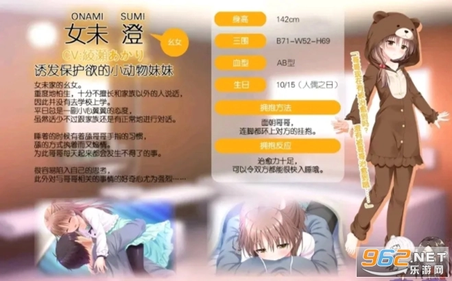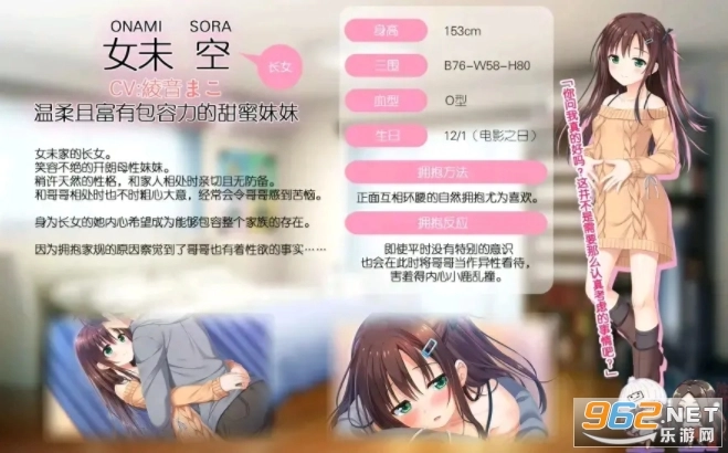 类游戏,改编自同名动漫。游戏拥有精美的人物立绘,还原了原作原汁原味的故事剧情,操作方式简单易上手。游戏中设置了四位性格与外貌各异的女主角,玩家将扮演男主角,以拥抱为核心玩法,与这些可爱的妹妹