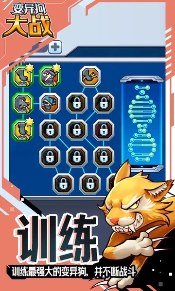 在游戏中,玩家需要操控自己的狗狗完成对战任务。玩家将带领一只经过改造的变异狗,前往世界各地与其他变异怪兽展开较量,体验激烈厮杀的快感。随着游戏进程推进,除了狗狗,玩家还能解锁更多不同角色。在游戏的实验室里,可以为变异狗植入各类强化基因进行改造,提升它的攻击力、生命值、防御力等各项能力。当你的突变体改造完成后,就能让它参与战斗了。5级之前,玩家可以在世界任务地图中挑战不同的变异怪兽;达到5级后,则可以与其他玩家进行PVP对战。