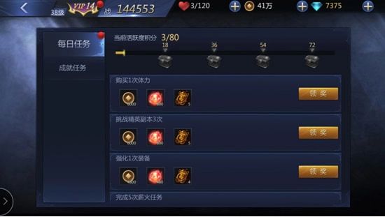 每日任务涵盖了日常玩法的各个方面,像挑战普通副本、精英副本以及竞技玩法等,大家不必担心任务难度过高难以完成,完成任务后别忘了进入任务界面领取相应的奖励哦~~