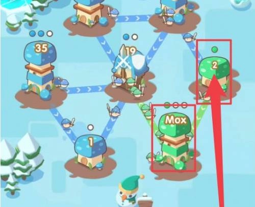 3、如图所示,点击下方的【技能图标】,使用冰系技能就能依次击败所有【绿色蘑菇】。