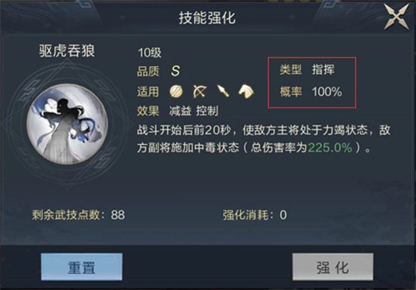 1、指挥类:这类技能是必定会触发的,像荀彧的技能就属于指挥类,触发概率为100%。它的效果是在前20秒使敌方主将进入力竭状态(输出效果失效),随后对敌方两个副将造成较高的伤害。