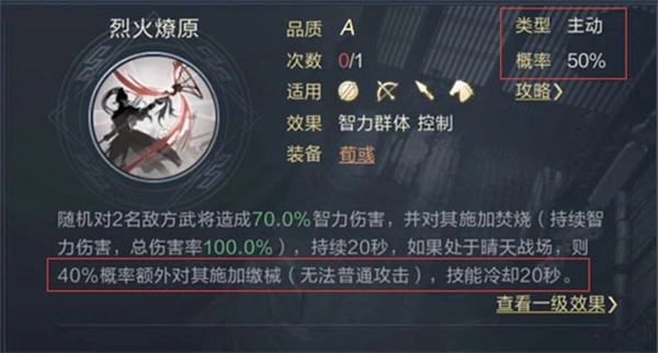 3、高概率主动技能:通常而言,发动率≥50的主动技能可被视为高概率主动技能。低概率主动技能则是发动率≤40的主动技能,若某个技能不具备发动机制,那它和未携带该技能几乎没有差别。