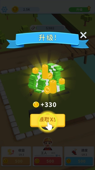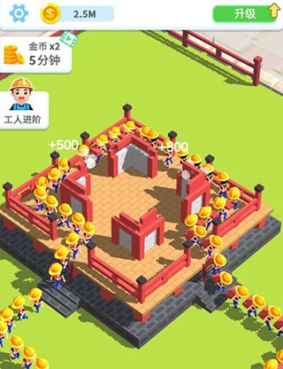 2、每位工人可获得500金币的收益,点击升级即可领取相应的金币大礼包。