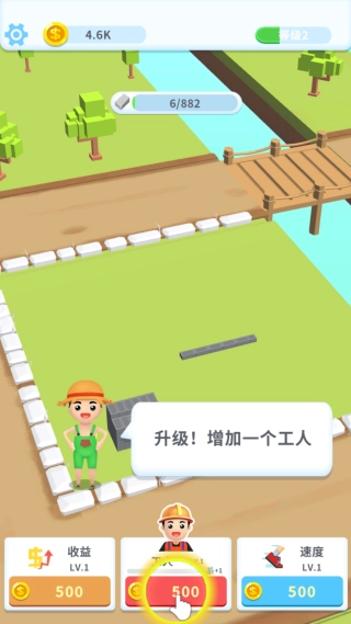 1、刚开始我们需要做的是购买一个工人来准备搬砖,花费500金币就能增加一个工人。