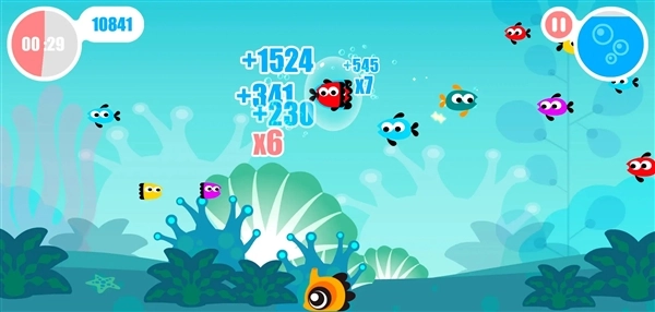 6、一个气泡要尽可能抓取更多的鱼,原因是气泡内的鱼数量越多,每条鱼的得分就越高(比如假设每条鱼基础分值为100,用同一个气泡抓第一条鱼得100分,第二条得200分,第三条得300分)。不过实际游戏里不同鱼类的基础分值有差异,所以建议尽量把分值高的鱼放在后面抓取,这样能获得更多的分数加成。
