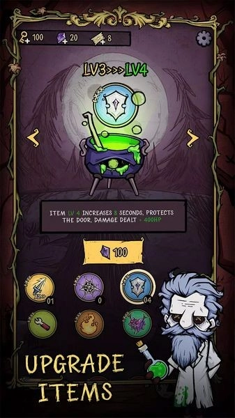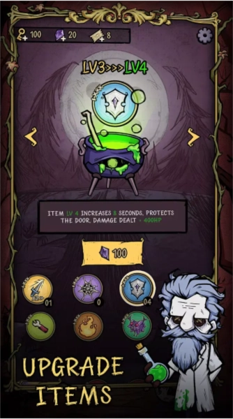 3.作为守卫者,大家要努力加固宿舍大门、提升防御能力,防止猛鬼闯入;可以用金币升级大门、布置塔防,这很考验发展策略。