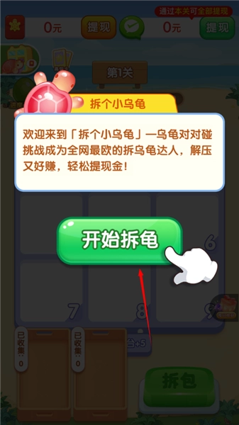 《拆个小乌龟赚钱》是一款超人气的趣味休闲合成游戏!游戏里遇到相同颜色的小乌龟就能合成,合成到一定数量后,既可以解锁关卡,还能拿到不少奖励!玩家通过拆包获取各种颜色的乌龟,它们会按特定顺序排列在格子里,满足相应条件就能消除并获得积分,达到指定分数就能通关,每次通关都有小红包奖励!玩法轻松休闲,奖励也特别丰厚!