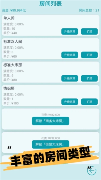 在酒店经营主题的模拟中,打造不同类型的客房能够满足各类客户的需求。若想解锁更多客房,前期需要储备足够的资金。在此过程中,你可以通过提升家具等级来吸引更多顾客,同时提高客房的定价。