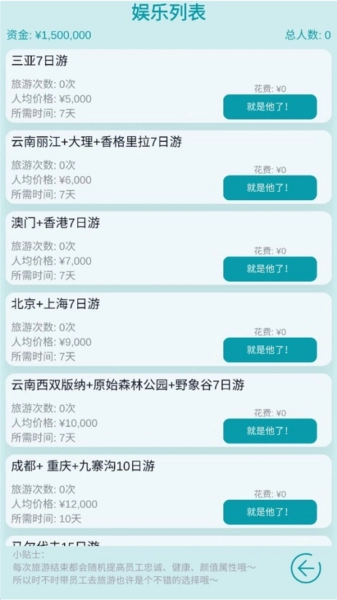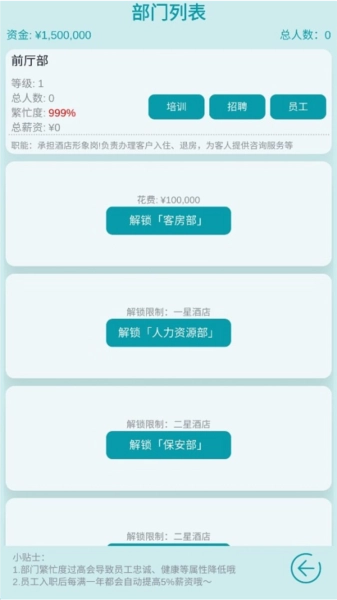注意:当部门繁忙程度过高时,会对员工的各项属性产生影响。目前已为员工设定了能力、忠诚度、颜值、健康状况、年龄、身高体重等属性;这些属性的数值不同,会触发不同的事件。