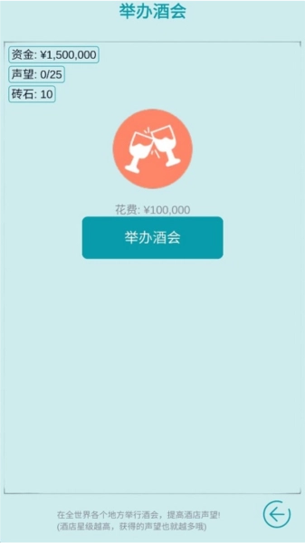 具备了上述要素后,若想吸引更多客流,营销环节就显得尤为关键!借助的“酒会”功能,能够提升酒店的声望,而且酒店的星级越高,所能获得的声望也会相应增加。举办酒会不仅能迅速扩大酒店的影响力,还能进一步为酒店带来更多的客流量。