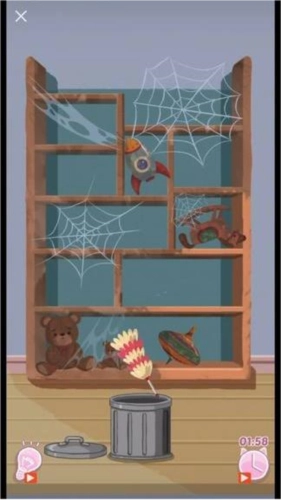 进入场景后,首先对整体环境进行观察,弄清楚杂物的分布情况和具体类型。像展示的书架场景中,存在蜘蛛网、玩具之类的杂物;厨房场景里则有脏盘子、食物残渣等。提前掌握这些信息,有助于合理安排清理的先后顺序。