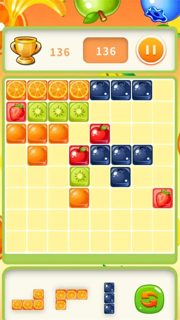 2.把下方的水果方块移动到上方的方格内,一旦方块将某一行或某一列填满,就能消除这些方块。