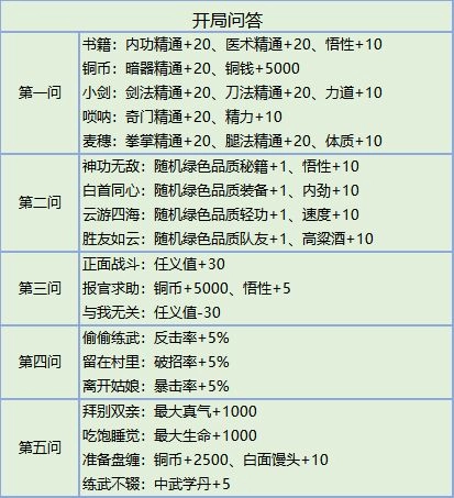 第一个问题:这个问题会决定你之后主要玩哪个套路,对应的分别是医术、暗器、剑法、枪棍、拳腿。