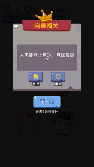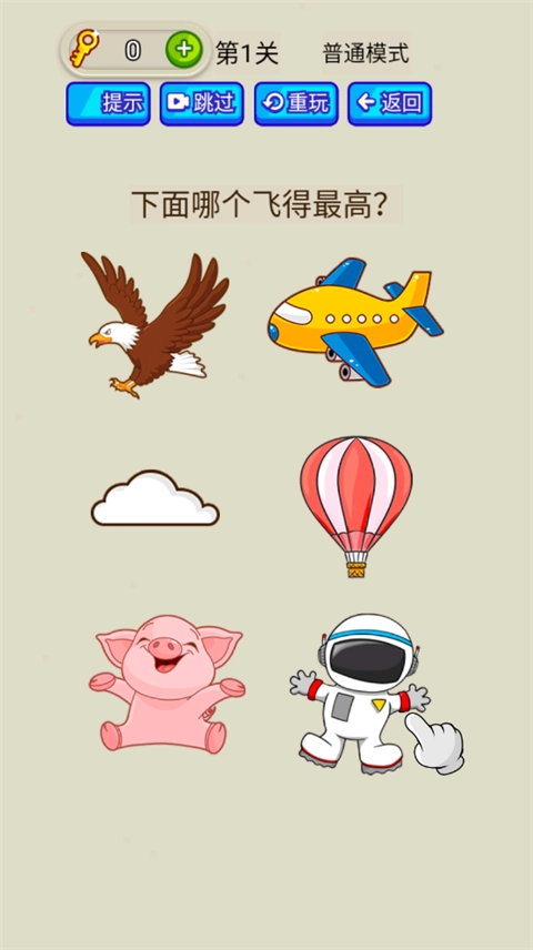 2、第一关的题目是“以下哪个飞得最高”,答案是宇航员,选择他。