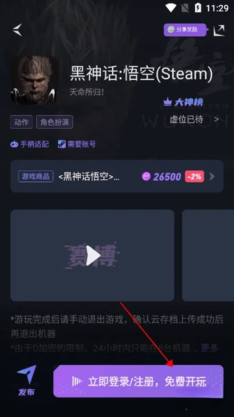 5、点击“开玩”按钮,就能立即开启专属于你的云版《黑神话:悟空》体验之旅。
