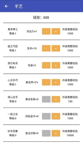 手艺:在女娲塔内,击败野怪会让女娲获得经验值,消耗这些经验值提升手艺后,女娲能捏出更强大的人类!这会永久增加初始属性。