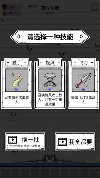 3、每一轮升级都会给出三个强力技能选项,玩家可自由搭配组合,打造出独属于自己的战斗风格;