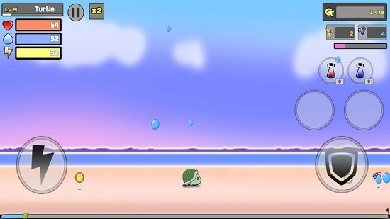2、在海滩场景里操控乌龟移动,收集空中的蓝色水滴,保持左上角血量、水量等属性条的状态,点击左侧的闪电按钮来释放技能。