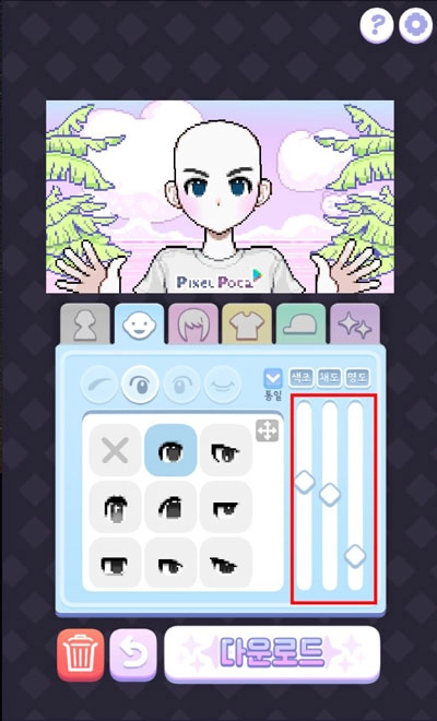 4、在眼睛选择界面,拖动右侧的滑杆能够调整眼球的颜色与亮度等参数。