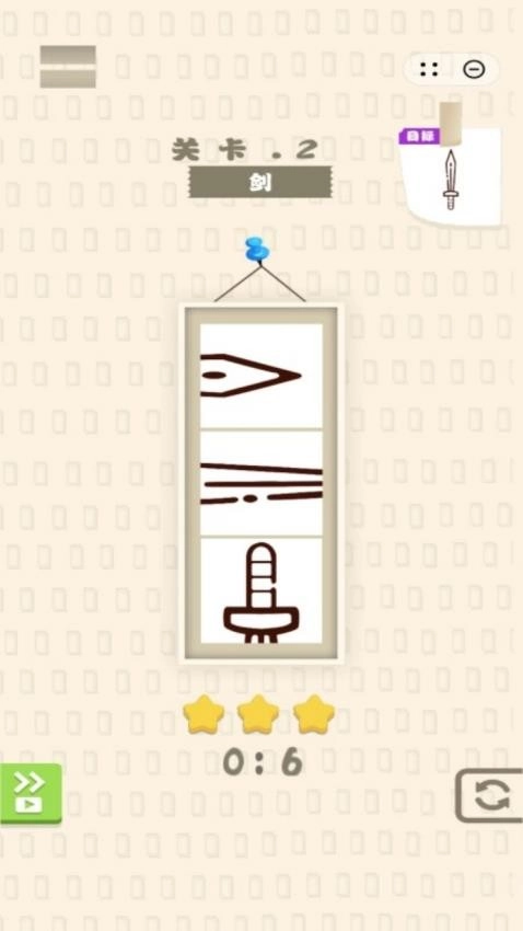 3、第二关中出现了“剑”这一题目,只要按照特定顺序调整图案的布局就能完成,完成后可取得三星成绩。