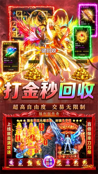 3、游戏里的装备全靠打怪掉落,神装能长期保值,所有装备都能回收兑换元宝,还能挑战比自己等级高的怪物打宝,爆率特别高,不用氪金也不用肝,体验非常好。
