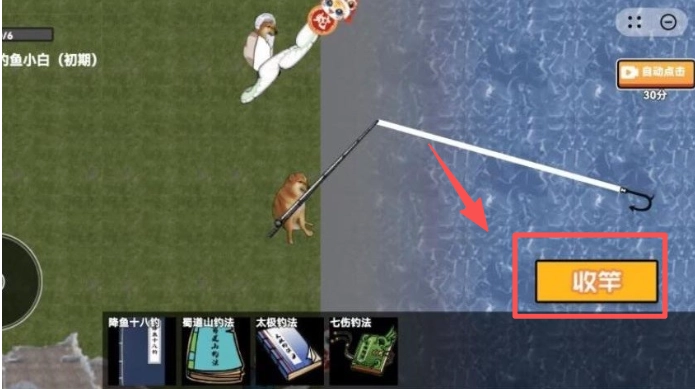 4、点击“收竿”按钮可收回钓竿,该操作用于收回你的钓竿与鱼获。