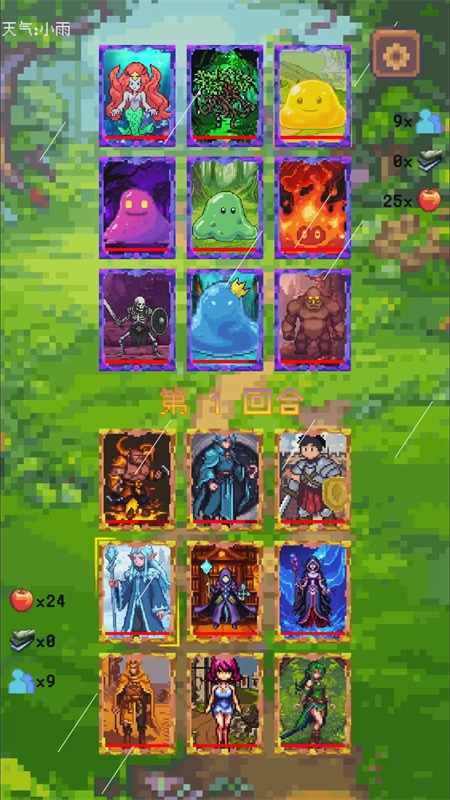 1、在九宫格布局中安排英雄站位,与上方的怪物展开对战。每个回合需针对单个英雄进行操作,可供选择的行为策略十分丰富。
