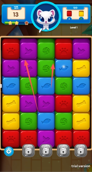 1、找出相邻的相同图案方块并点击消除,同时留意新掉落方块的布局,借助自然形成的组合来实现连续消除。