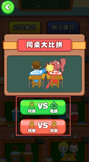 《同桌大决斗》是一款休闲益智类游戏,采用卡通动漫风格,结合恶搞趣味玩法与逼真的音效,打造出魔性又诙谐的校园场景氛围。游戏中,玩家可以邀请好友一起扮演同桌角色,在老师转身的间隙展开手速比拼——通过快速点击按钮来获取分数,同时还得时刻留意躲避老师的视线,一旦被发现就会直接失败。游戏包含双人PK、合作模式以及多款小游戏,每局游戏限时1分钟,最终将根据分数高低来判定胜负。玩家能在游戏里重温经典的校园时光,感受幽默的剧情和紧张的对抗过程,非常适合和好友一起体验轻松解压的欢乐时光。