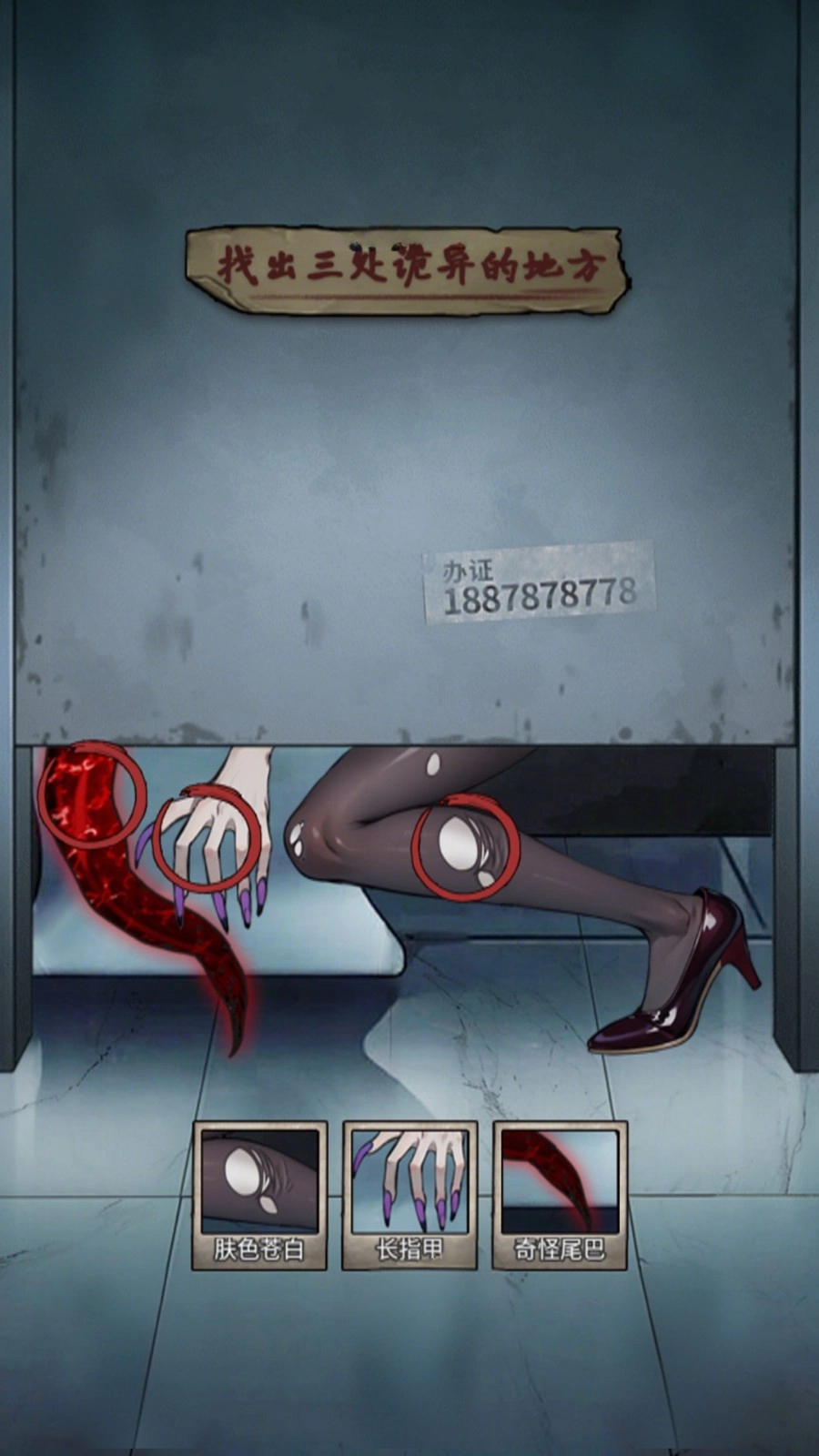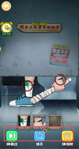4、除了已标记的绿色液体,还要留意人物手部的伤痕等其他异常细节,依次点击这些异常点,还可以使用下方的提示以及tiaog。