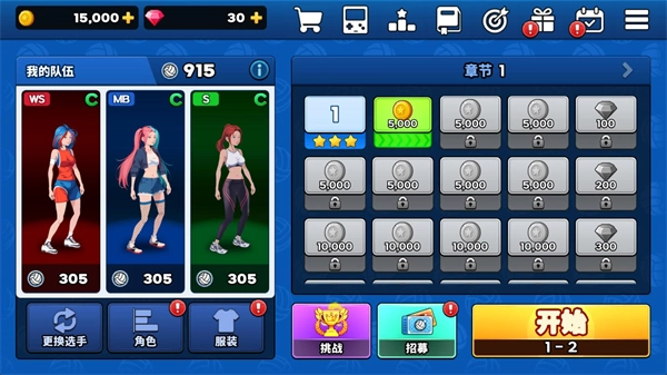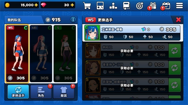 2、点击主界面的“更换选手”按钮,即可挑选不同位置的角色安排上阵。
