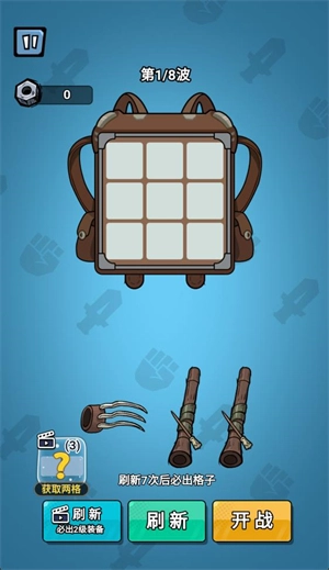 2、进入关卡后,玩家需将初始武器放置到背包的格子中。相同的武器能够通过合并来提升等级,点击刷新按钮则可获取新的武器。