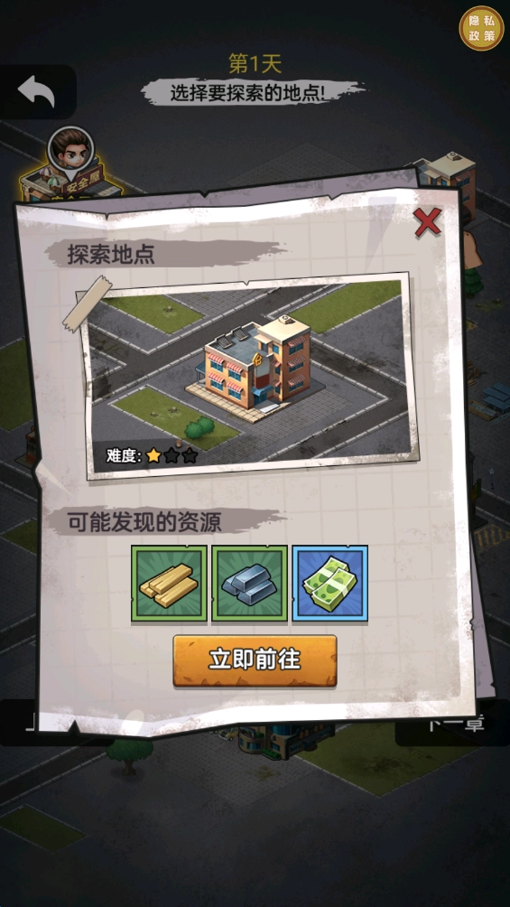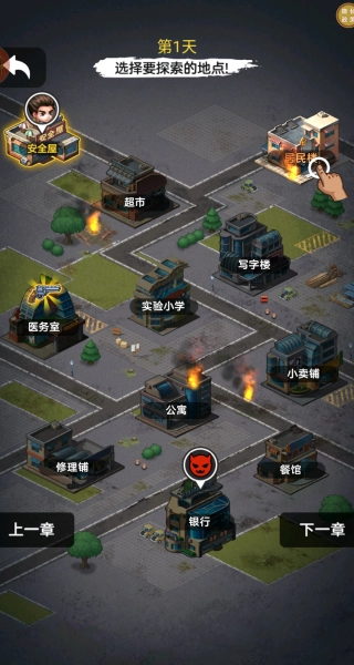 3.进入“第一天求生”任务后,点击【探索】按钮就能外出行动,在废墟里收集食物和武器,增强战斗力来抵御丧尸的袭击。