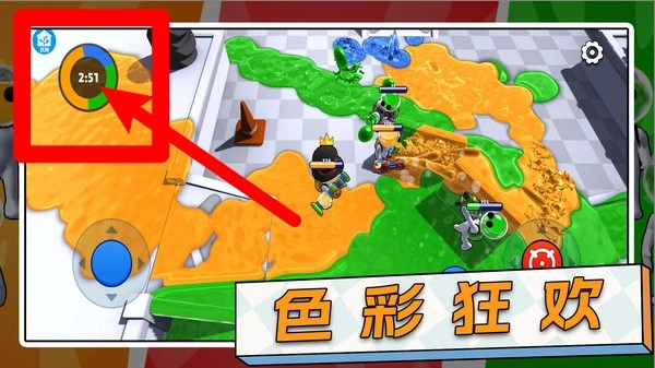 2.比赛时间:屏幕左上角的圆形计时器会清晰显示当前剩余时长,玩家需要在规定时间内尽可能多地喷射区域。