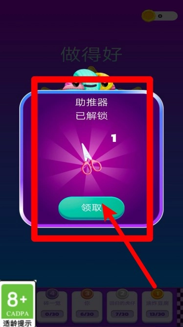 2.通关后能解锁剪刀类助推器道具,点击领取按钮就能添加到背包,在关键时刻帮你解开复杂绳结。